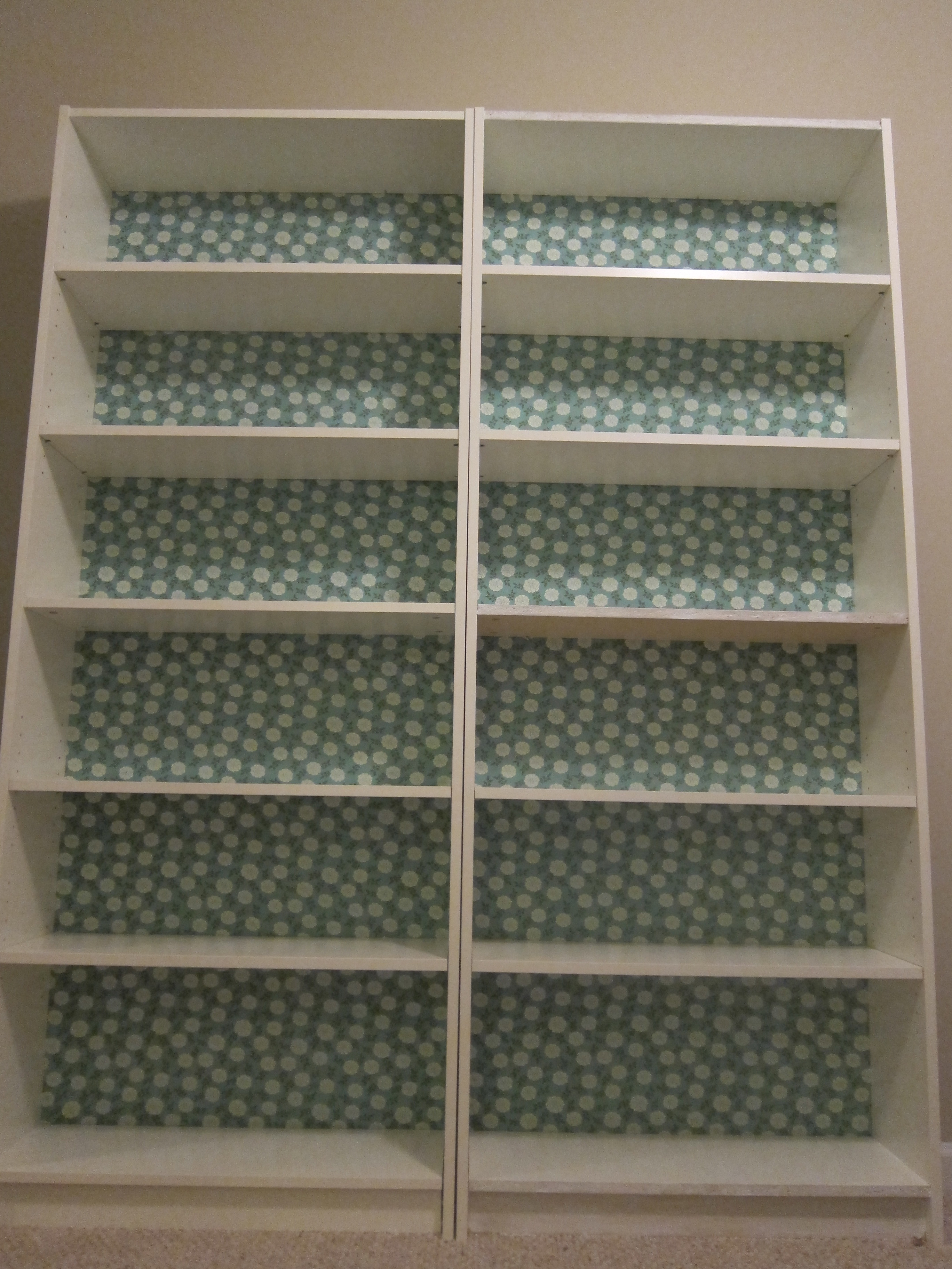 I put a couple of the shelves in backwards on the right hand shelf, and I had to paint the exposed particle board white. I suppose I could have unscrewed the pieces and done it the right way, but when you’re putting together an IKEA bookcase, you hit a point where you’re like, “Eff this, I just want it to be over.”