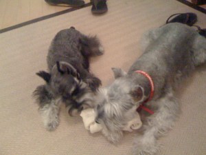 She’s not particularly motivated to be Lassie because she gets by on her looks 90% of the time. She’s abnormally small for a schnauzer, and she looks like a perpetual puppy. Here’s a picture of her with her best frenemy Bailey for comparison.