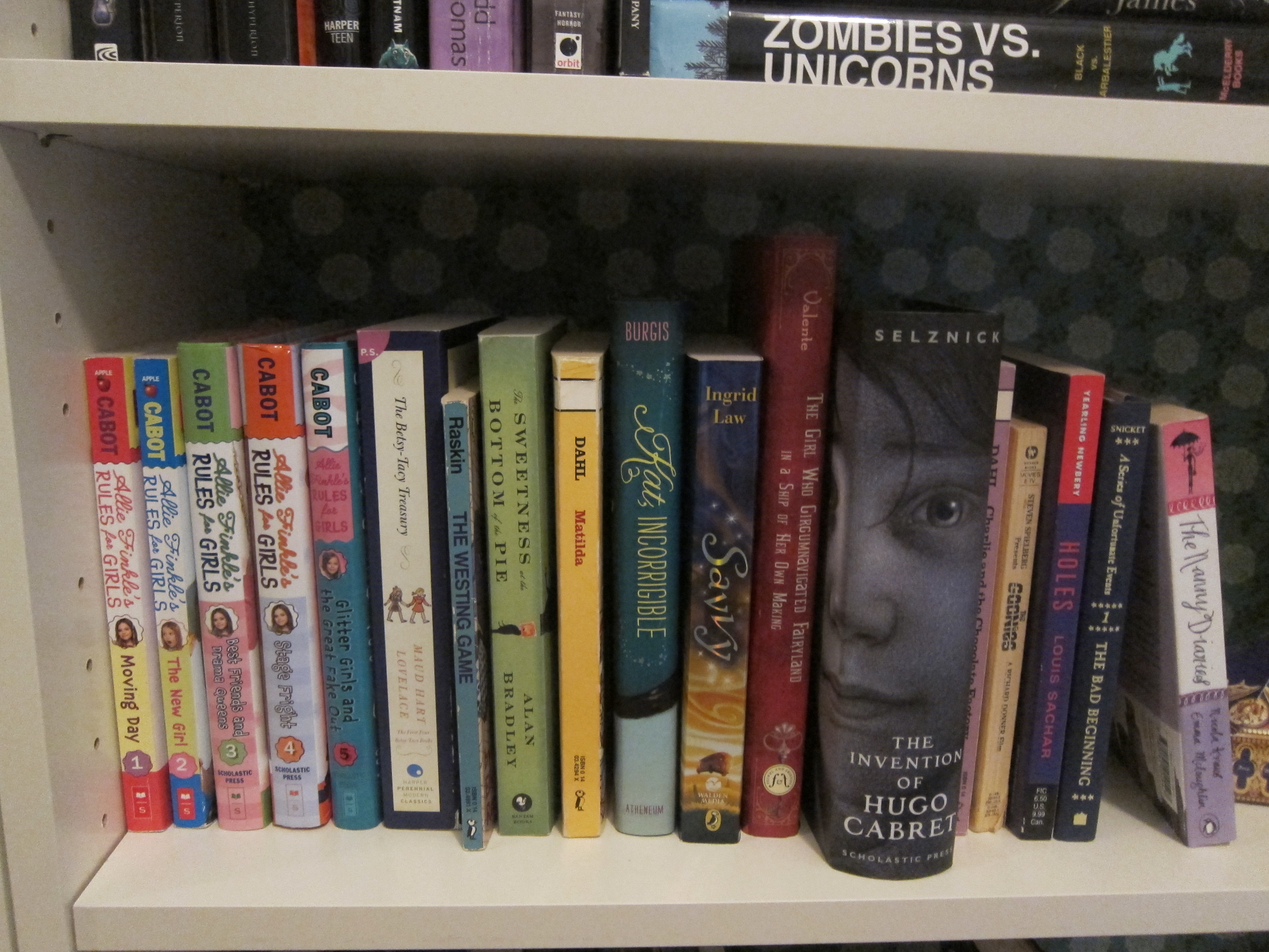 The books about precocious kids all got together for a wild rumpus on one of the lower shelves. Allie Finkle is pretending to be a foreign ninja warrior princess with Betsy and Tacy, while Turtle Wexler and Flavia de Luce start a girl’s detective agency. The kids from The Goonies (Yeah, I have the movie novelization. Jealous?) are joining up with Stanley Yelnats and the other delinquents from Holes to find a way to rescue the Lemony Snicket kids (“Orphans never say die! Down here, it’s our time!”), while Matilda and Kat Incorrigible sip tea and discuss Regency era romances and take turns moving things with their eyes to freak out the other kids. I thought about pairing Nanny from The Nanny Diaries with a cute single memoir guy, but I needed someone to wrangle the moppets at bedtime.